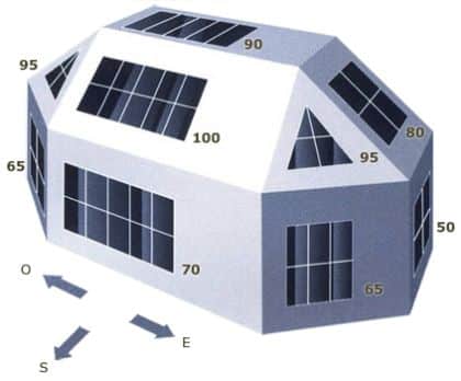 Rappelons que les conditions idéales sont un toit orienté plein sud et des modules inclinés à 30°. Les écarts par rapport à cette situation idéale doivent tenir compte des principes suivants: